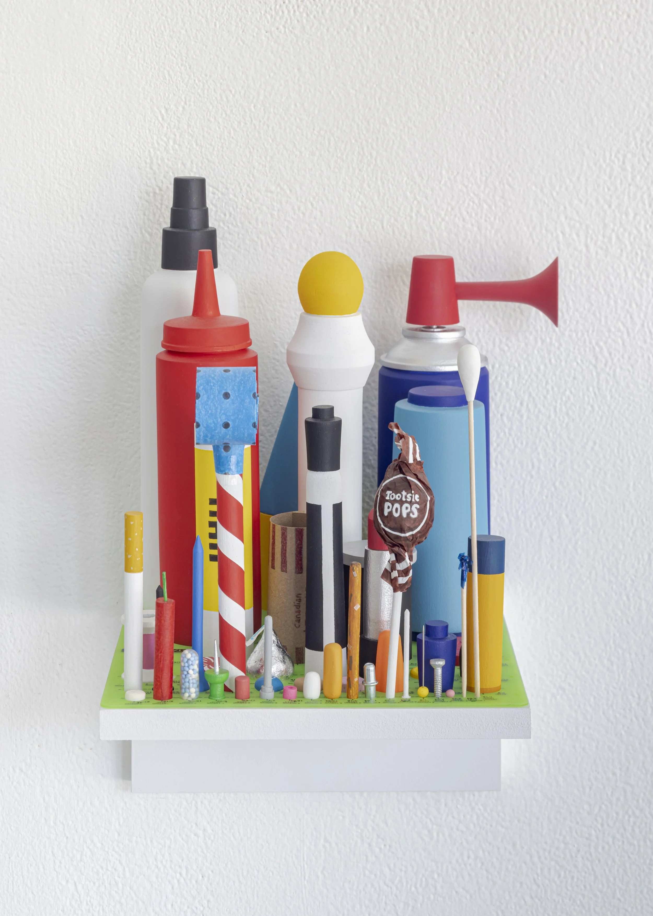 Often deconstructing art tropes, Partheniou’s practice employs the replica as a tool for evoking the experience of perception through the deconstruction and contemplation of common everyday objects. Rendered mostly in acrylic paint on wood, compositions exist in three dimensions functioning as tromp l’oeil in the round. Yielding to found formal properties such as shape, size, pattern and colour, each composition is led by the constraints inherent to the object itself, while drawing out visual puns and revelling in material play.