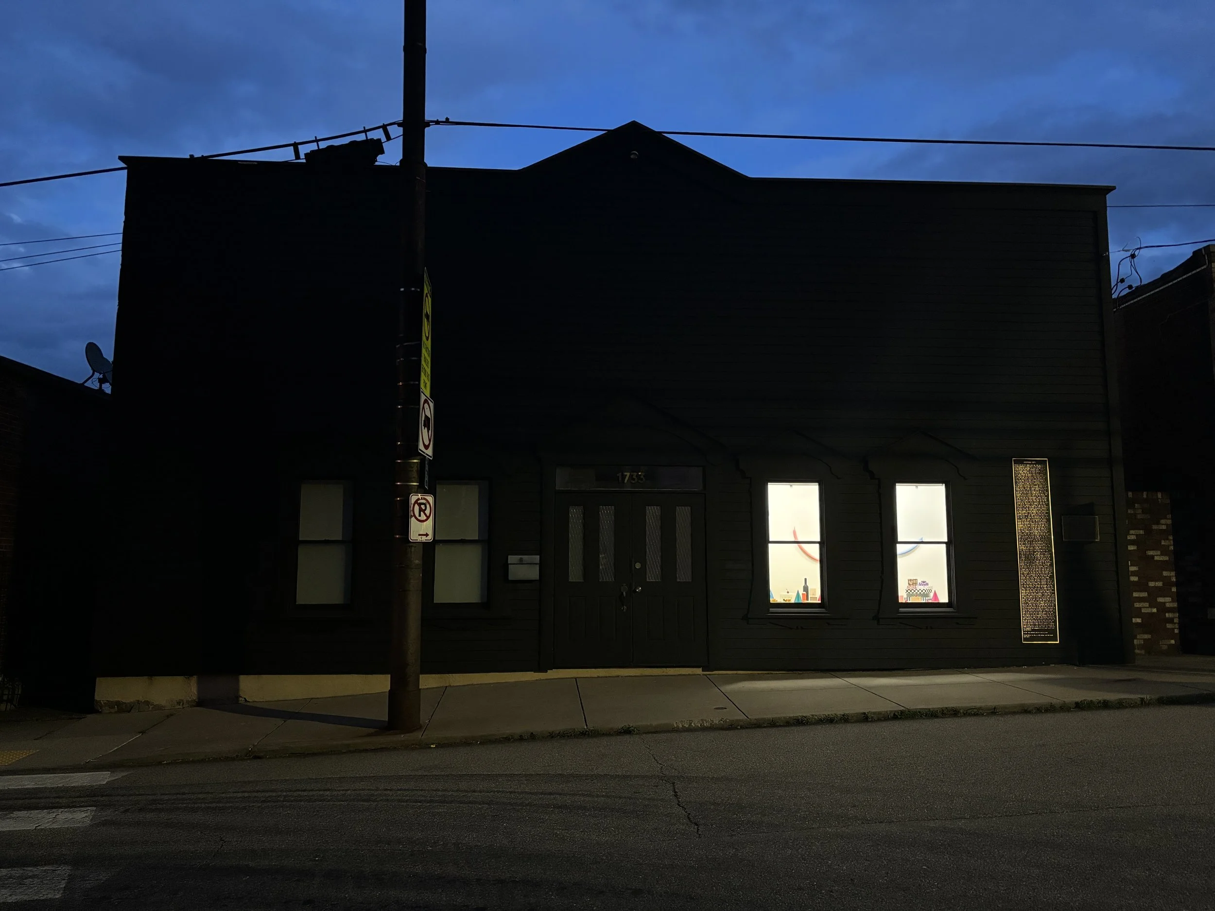 A series of stray balloons dot Lowrie Street, lodged inside a salon, notary office, pizza place, residence and elementary school.