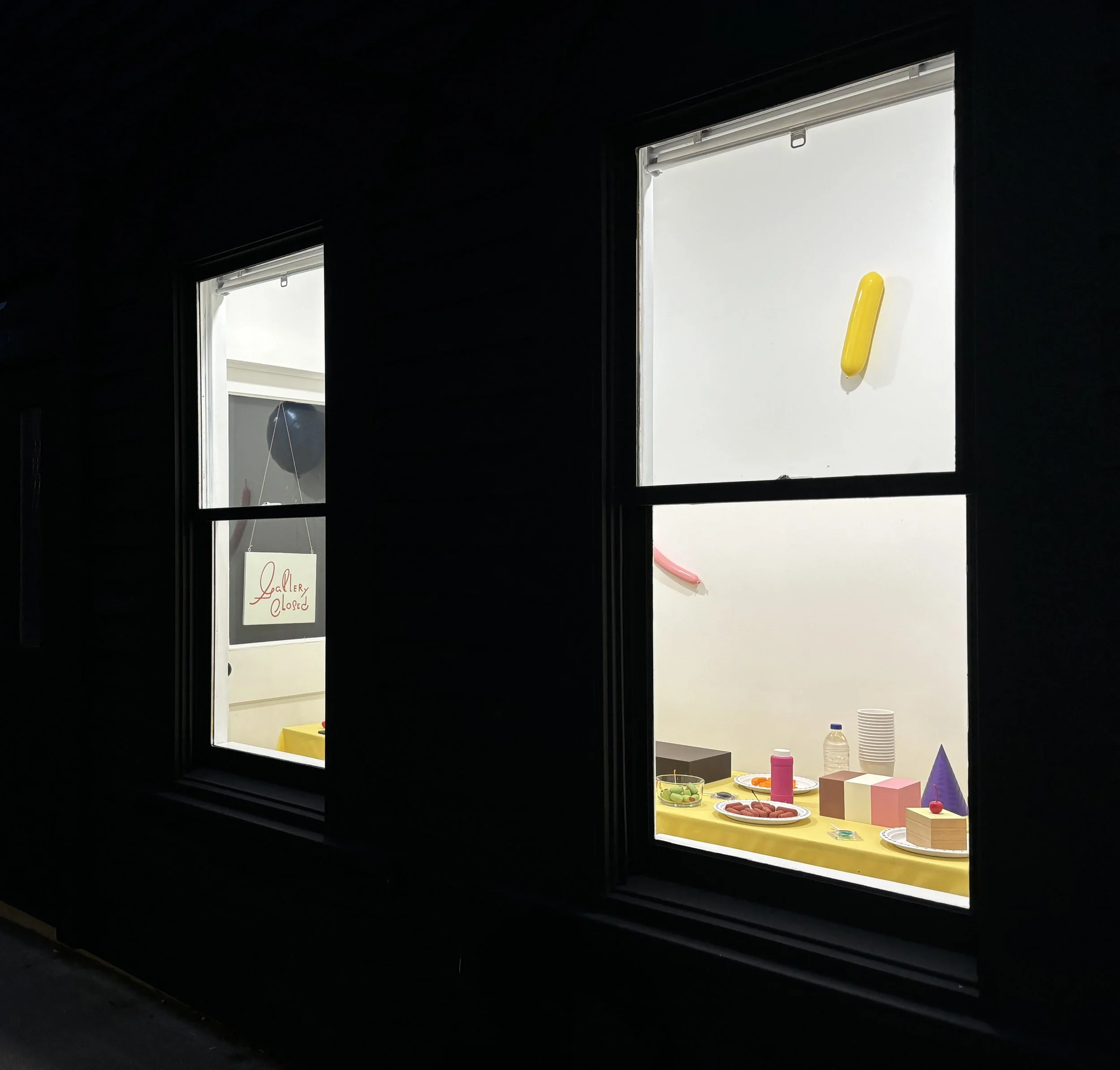 “A series of stray balloons dot Lowrie Street, lodged inside a salon, notary office, pizza place, residence and elementary school. The source of these wayward party favors is revealed to be a fish-bowl style party room, the kind you might find in a neighbourhood cinema or play facility. A surprise-party of sorts, the sprawling banquet table is comprised entirely of meticulously rendered gifts, hats, snacks, cake, confectionary and other party paraphernalia, ranging from detailed to reductive sculptural copies.