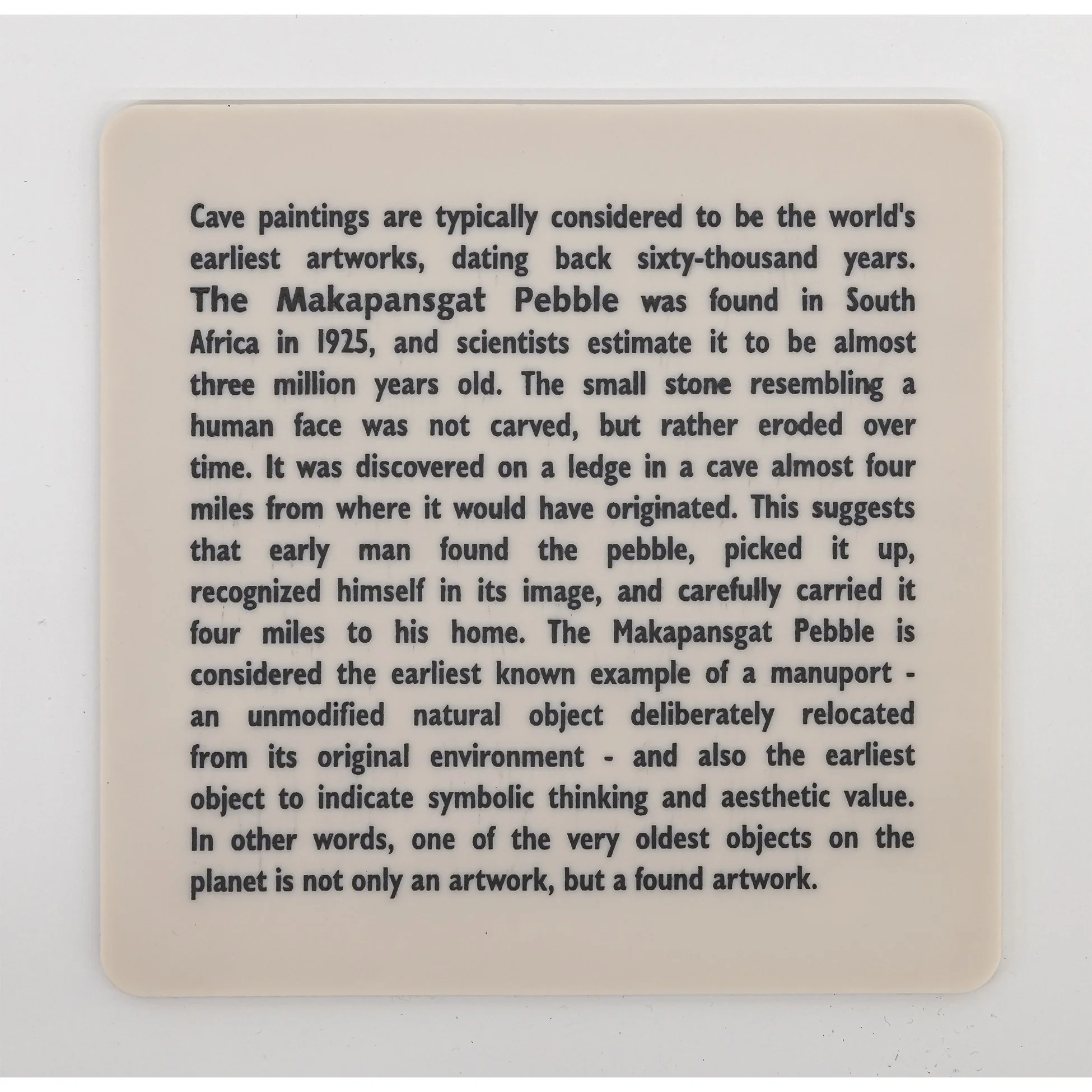 The Makapansgat Pebble, found stone encased in resin, laser-engraved plexiglass. Varied edition of 5, 2025.